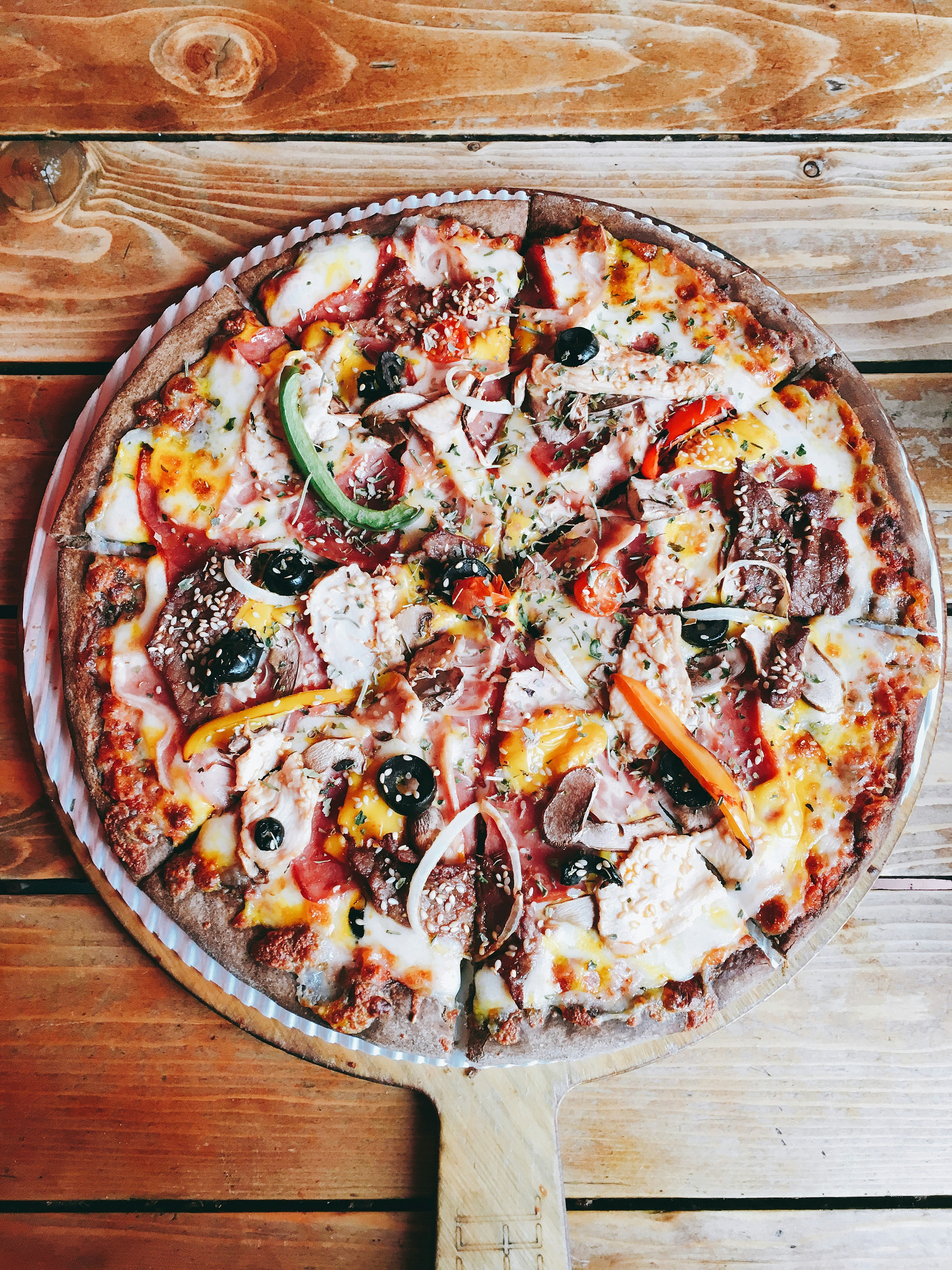 Mozzarella, viande hachée, poivrons, oignons, olives